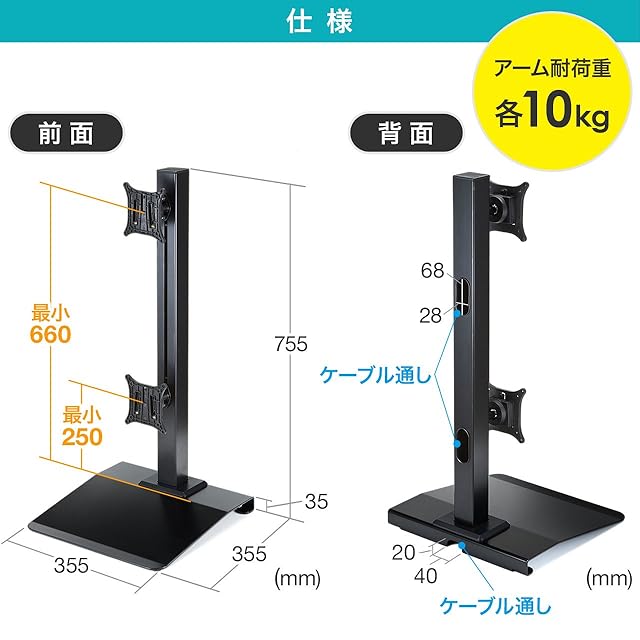 商品名:サンワダイレクト スタンド モニターアーム 置き型液晶アーム デュアルアーム 上下2面 耐荷重10kg 100-LA032