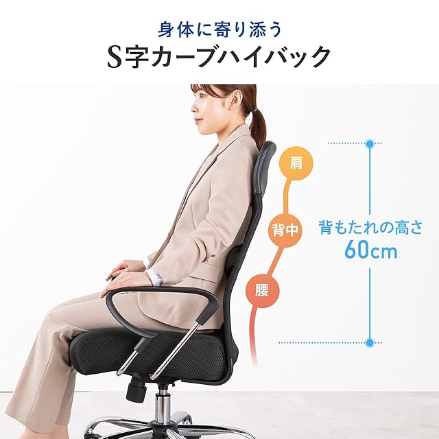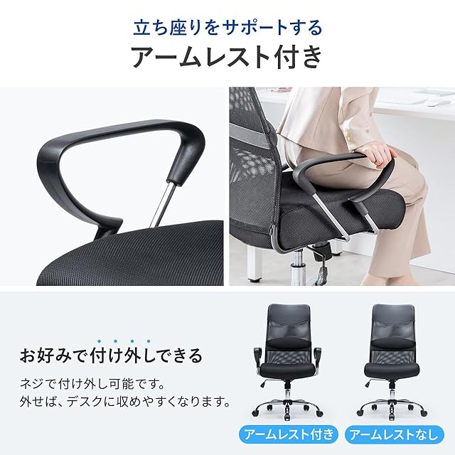 商品名:サンワダイレクト オフィスチェア メッシュ 肉厚クッション ハイバック ランバーサポート ロッキング機能 着脱可能 アームレスト付き キャスター ブラック 150-SNCM40
