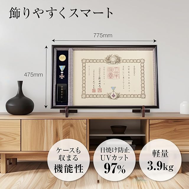 【意匠登録1562065号】勲章ケースまで飾れる、春・秋などの叙勲で戴く勲記(賞状)と勲章専用の額縁。額縁外寸(475×775ミリ、約3.9kg)木製黒タメ色、ラッカー仕上げのフレーム。額縁内部には、日本産の最高級額装用裂地を張り込みました。勲章ケースを立体的に飾れる深さを確保しつつ、叙勲額としては最小クラスの省サイズ化を実現!長野県の自社工場で製作する、額縁のタカハシ・オリジナル商品です。瑞宝単光章・瑞宝双光章・瑞宝小授章・旭日単光章・旭日双光章・旭日小授章に対応。これらの勲章ケースの大きさは66×130ミリで、勲記(賞状)の大きさは420×595ミリです。前面と賞状面に2重でアクリルが入る2重アクリル仕様。賞状をテープなどで留める必要がありません。UVカット強化型のアクリルが98%程度の紫外線をカットし、大切な品物の日焼けを軽減します。吊具・紐・一個箱付き。勲章やケースのセットも簡単(説明添付)です。勲章、勲章ケース、賞状、壁面の金具は付属しません。額縁の裏に紐は付属しておりますが、額受金具や額立てなどは飾る場所に合わせて別途お求めください。[別途、額立てをお買い求めいただく際は高さ430Hが推奨です]