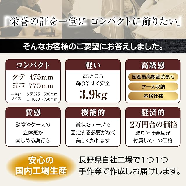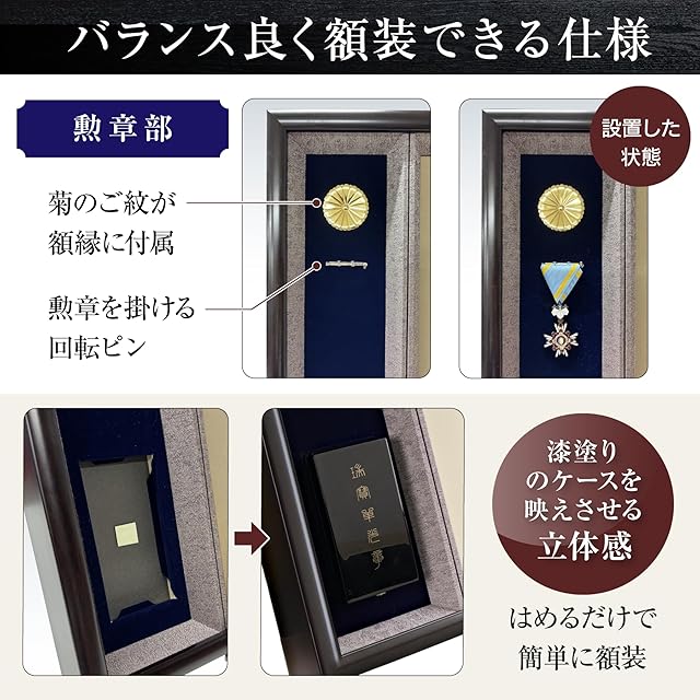 吊具・紐・一個箱付き。勲章やケースのセットも簡単(説明添付)です。勲章、勲章ケース、賞状、壁面の金具は付属しません。額縁の裏に紐は付属しておりますが、額受金具や額立てなどは飾る場所に合わせて別途お求めください。[別途、額立てをお買い求めいただく際は高さ430Hが推奨です]