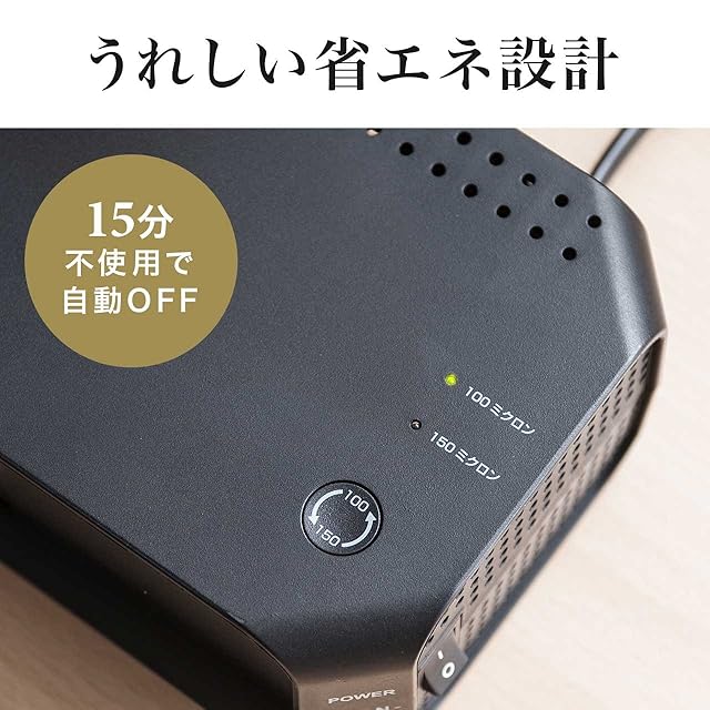 ラミネートできる温度になると、LEDランプの点灯とアラームでお知らせします。15分間の不使用で自動で電源OFFになる省エネ設計です。