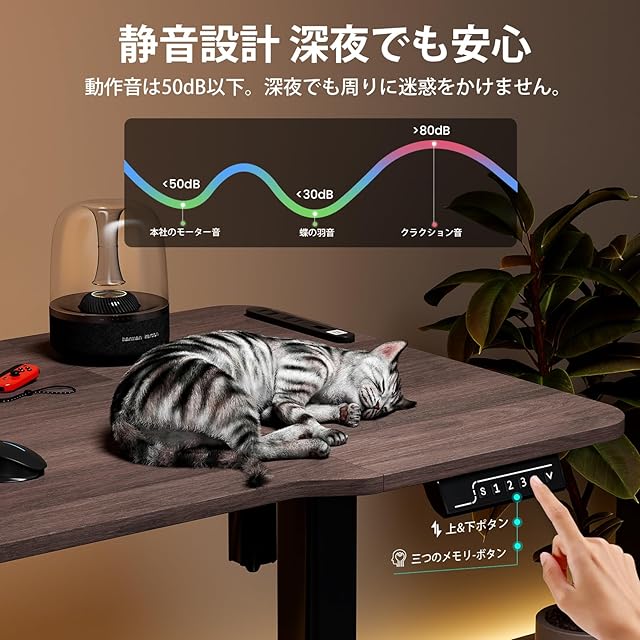 【多機能手元コントロールで精密操作が可能】6つのボタン付き手元コントロールパネルを搭載し、3段階のメモリー機能、上下昇降ボタン、S設定機能、数値表示機能を備えています。S設定では、表示単位の変更、衝突検知の感度、傾斜検知の感度の調整が可能で、使用環境に合わせた柔軟なカスタマイズができます。直感的に操作しやすく、日々の使いやすさが抜群です。