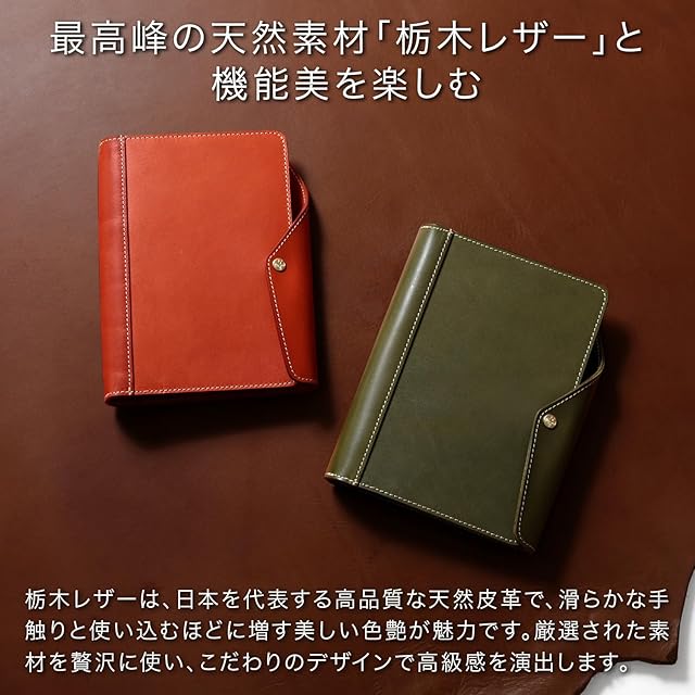 【こだわりの設計と個性的な魅力】 インデックスがはみ出しにくく曲がりにくい設計により、立てて収納が可能など実用性を追求しています。さらに、リング跡を軽減するリングサポーターを採用し、美しい背表紙を維持する独自設計を施しています。携帯性と実用性を両立し、高級感と使いやすさを追求したおしゃれでシンプルなデザインとなっています。長く愛用できる耐久性の高い設計の手帳カバーで、あなただけの特別なスケジュール帳に育てることができます。