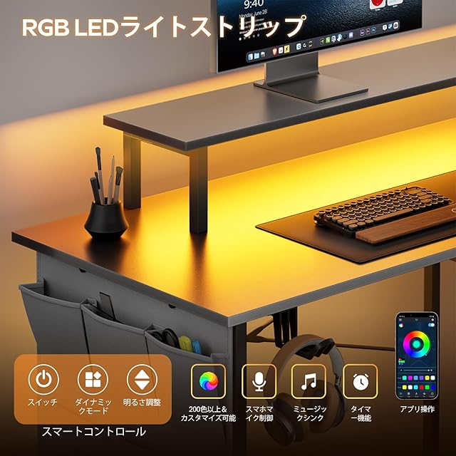 【オープンで使いやすいデザイン】L型デザインはコーナースペースを最大限に活用し、広い作業エリアを提供するため、マルチタスクに最適です。また、モニタースタンドが付いており、首の疲れを軽減し、快適性を向上させます。モニタースタンドの下にはLEDライトストリップがあり、アプリでリモートコントロール可能です。200種類以上のカラー照明モードを備え、視覚効果を高め、快適性と実用性を向上させます。デザインは作業効率を高めるだけでなく、機能性と美観も兼ね備えています。