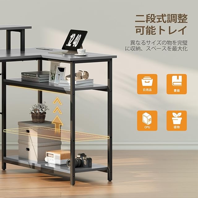 【十分な収納スペース】このデスクには2段のオープン棚が付いており、サイドパネルの高さは必要に応じて調整できます。PCケース、本、ファイルなどを収納でき、デスクトップのスペースをより広く使えます。さらに、サイドストレージポケットもあり、ゲーム機器、事務用品、ファイルなどの小さなアイテムを便利に収納できます。