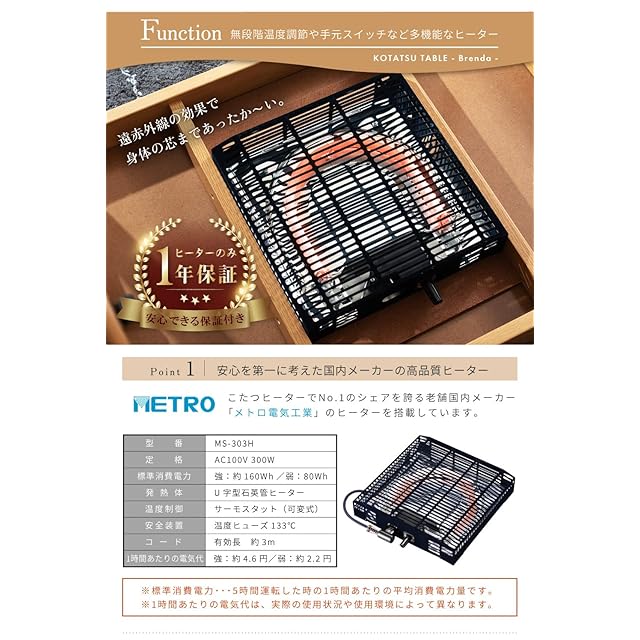 材質:繊維板/天然木(ラバーウッド)/ウレタン塗装/石英管ファンレスヒーター(MS-303H)/中間スイッチ