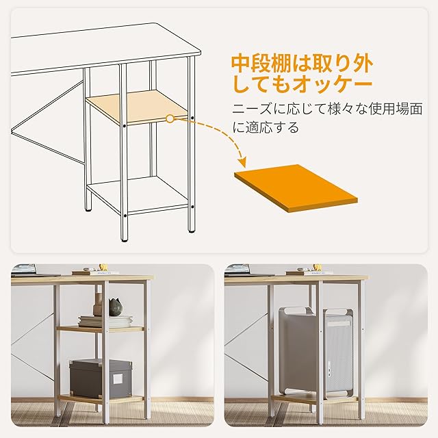 【収納能力】CubiCubi デスク l字 両サイドに棚板付きで収納力抜群!中段棚は取り外すこともできますので、ニーズに応じて様々な使用場面に適応します。