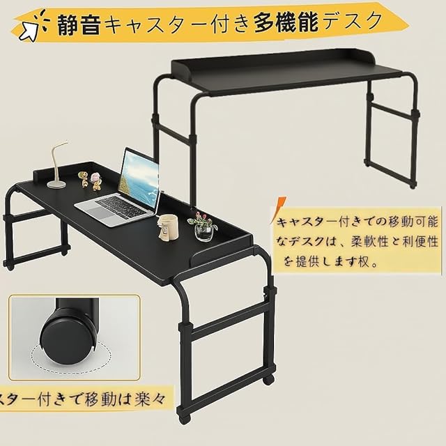 TUIYIDUO ベッドテーブル キャスター付き 高さ調整65-95cm 横幅調整120-210cm 伸縮 昇降式 サイドテーブル オーバーベッドテーブル 移動に楽々 机の幅は広い パソコンデスク リモートワークデスク 両足 安定型 病院 作業 勉強 家庭用(ブラック,210x44.5x95cm)