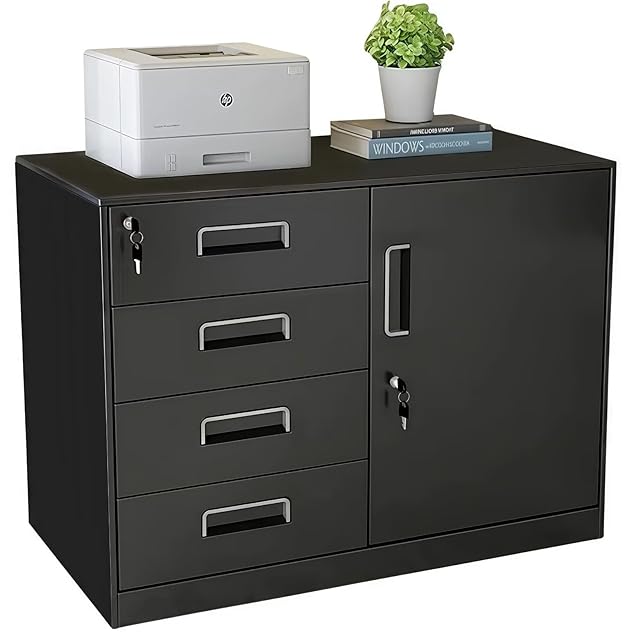 EastEamily オフィスキャビネット ファイル収納キャビネット 4段 75×39×58.5cm 調節可能 仕切り サイドワゴンキャビネット 鍵付き スチール製 袖机 机下収納 組立て不要 オフィス 事務所 更衣室 学校 業務用(ブラック)