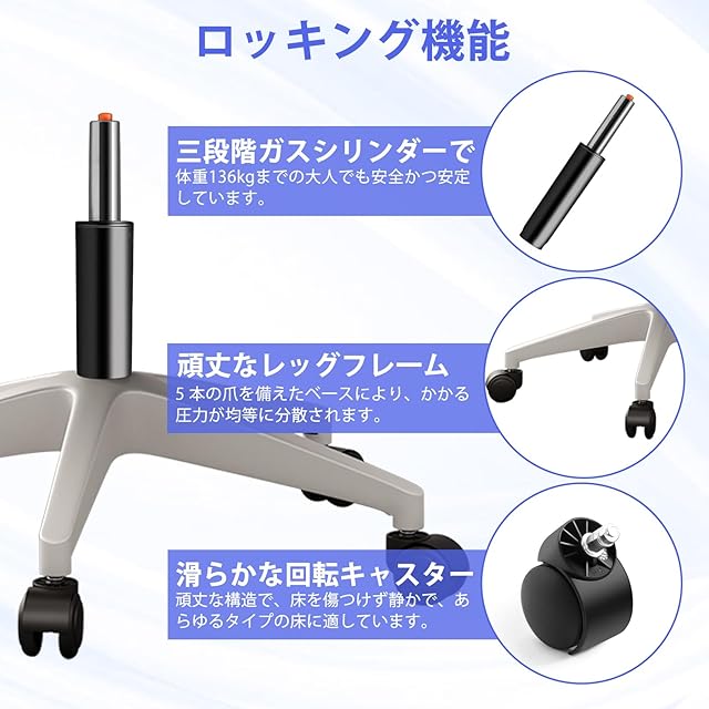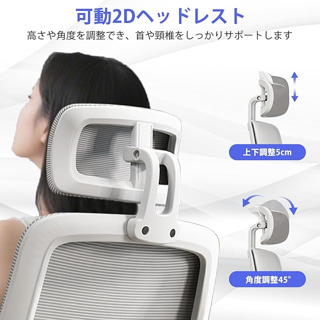 【可動式ランバーサポートとヘッドレスト】 人間工学に基づいたデザインで、ランバーサポートは上下3cm、前後3cmの範囲で自由に調整可能。可動式ヘッドレストは高さ6cm、角度45°調整可能。ユーザーの好みに合わせて最適な位置に調整できます、腰や首にぴったりフィットし、有効的に体の負担を分散して長時間座っても疲れにくいチェアです。