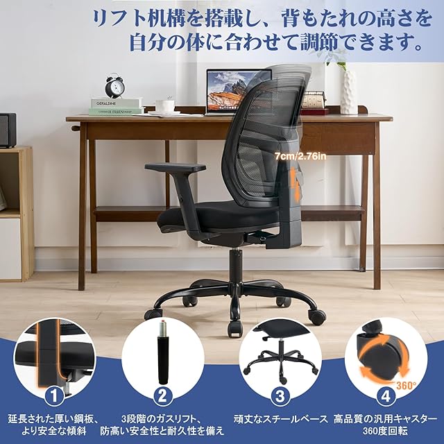 【多機能調節デスクチェア】: 人間工学設計に基づく高さ調節可能なオフィスチェアであり、背もたれは自由に昇降でき、異なる身長に対応します。360度回転可能で、背もたれには4段階の角度傾斜ロック機能があり、様々な作業姿勢をサポートします。省スペース設計で、勉強椅子としても最適です。