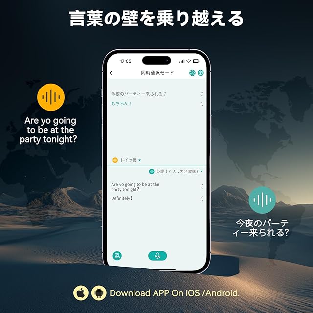 【スピーカーモード】スマートフォンを向けて相手に話してもらうだけで相手の会話がイヤホンにリアルタイム翻訳されます。ご自分の音声は翻訳された状態でスマートフォンから音声出力され、スピーカーから流れます。正確に伝えるため、画面上にもテキスト表示されるので正確なコミュニケーションが可能です。海外旅行で注文時やチェックイン時大変役に立ちます。