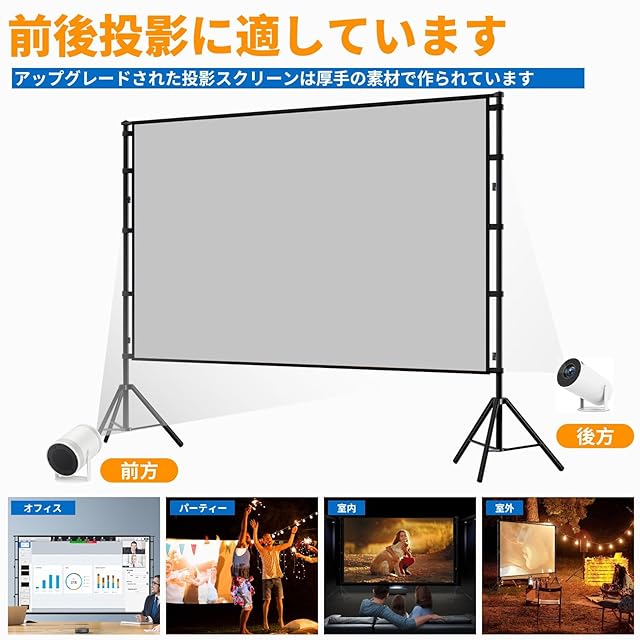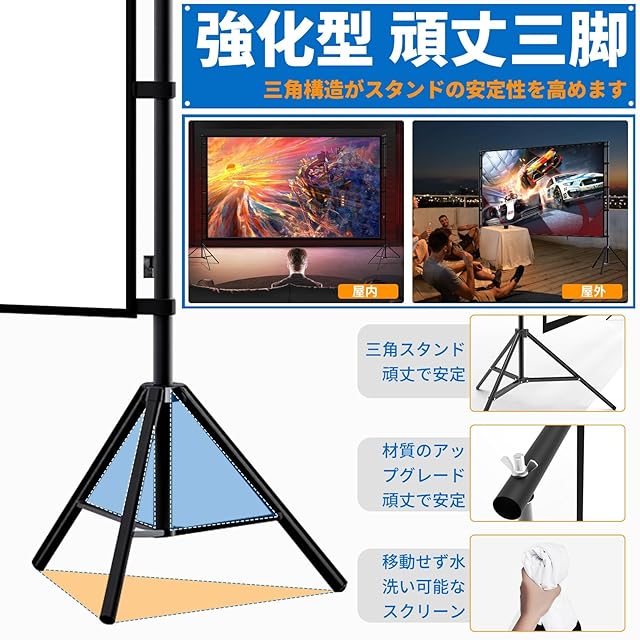 【高品質素材で耐久性◎】厚手で光を通しにくい投影布は、折りたたみ収納可能。屋外でも使える頑丈な三脚スタンドで、風や衝撃による倒れを防止。キャンプや庭での上映時も安定した性能を発揮し、安心して長時間使用できます。