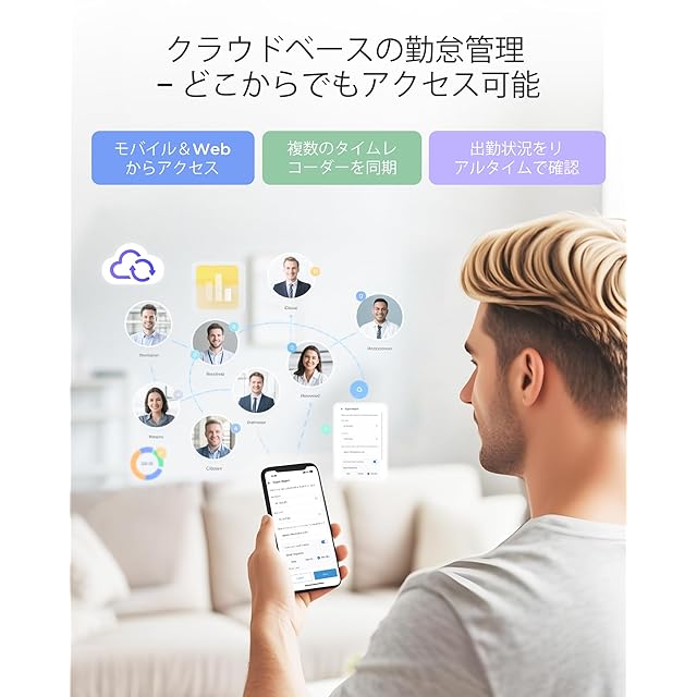 複数拠点のデータ同期: 複数のTC1タイムカード 機械をネットワーク連携することで、異なる拠点での打刻データをリアルタイムで同期可能。ネットワーク接続が一時的に切れても、後で自動的にクラウドへ同期されます。分散勤務や支店の多い企業に最適なクラウド型タイムレコーダーです。