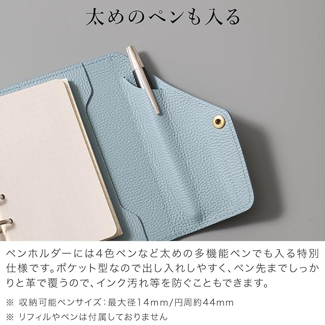 【素材と機能性の融合】 高級感と使いやすさを突き詰めた「本当に使えるシステム手帳 - ミニ6穴サイズ - 」は、「HUKUROオリジナルの本革(牛革)」シールドレザーを使用。ラグジュアリーな素材感とカラフルさが特徴です。信頼性の高いクラウゼ社製ドイツ製リング金具(内径20mm、6穴)を採用し、180~220枚の用紙(リフィル)収納が可能です。4色ペンなど太めの多機能ペンも収納できる特別仕様のペンホルダー(最大外周約27mm)やフラップ付きポケット(カードポケット)、大きめの用紙や冊子・ノートも挟める用紙押さえなど、機能性にも優れたビジネス手帳です。