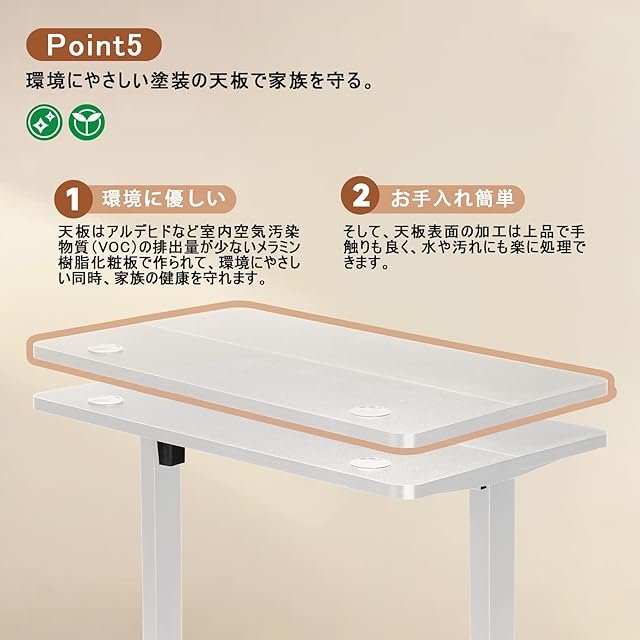 Point3【操作簡単なコントロールパネル|便利な高さ記憶メモリー機能付き】 Avocahom昇降デスクは先進のシステムを搭載しており、簡単なボタン操作で昇降可能、高さを無段階で調整することができます。上下ボタンに加えて、お好みの高さを2パターンまで記憶できるメモリー機能を搭載しています。例えば「座り作業」と「立ち作業」の高さをそれぞれ登録しておけば、ボタン一つで瞬時に切り替え可能。毎回の細かな調整が不要になるため、作業の中断を最小限に抑え、リズムよく仕事や勉強に集中できます。それ以外過熱保護の機能つきます。もっと詳細には同梱に添付された日本語説明書をご覧ください。