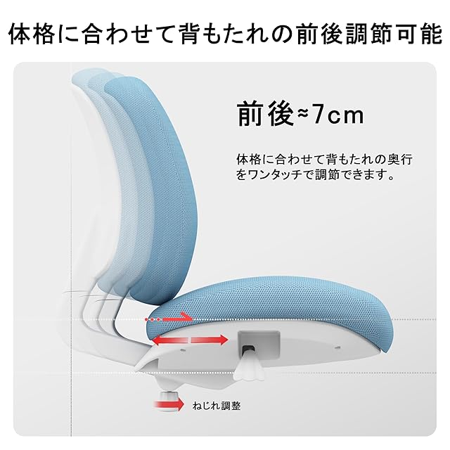 「人間工学設計・7cm前後調整可能の背もたれ」背もたれは、曲面のデザインがより背中の曲線に合い、脊椎にケアを与えます。背もたれの前後を調整でき、より良い腰のサポートが得られ、異なる年齢層の子供に対応します。ウレタン製のクッションで体圧分散に優れ、長時間の勉強でも気分転換できます。