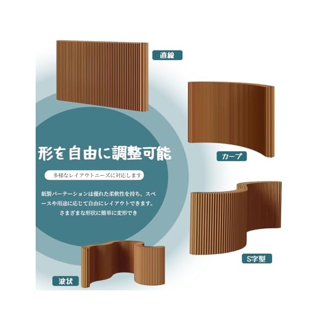 【形を自由に調整可能】紙製パーテーションは優れた柔軟性を持ち、スペースや用途に応じて自由にレイアウトできます。直線、カーブ、S字型、円形など、さまざまな形状に簡単に変形でき、空間の輪郭にぴったりと合わせて、多様なレイアウトニーズに対応します。