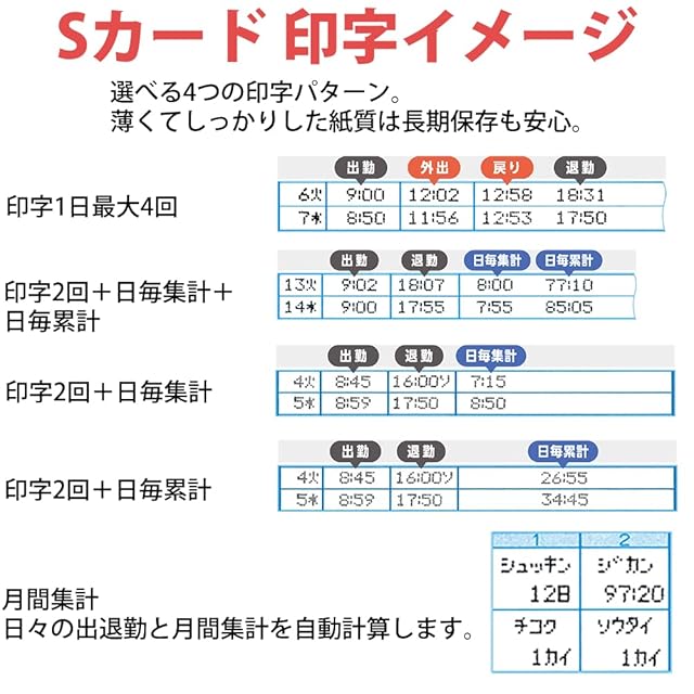 【マックス タイムレコーダー 説明3】印字内容/日付・曜日・時分・時間数、徹夜勤務対応/あり、集計内容/所定内労働時間、実労働時間、早出時間、残業時間のいずれか1種類、シンボルマーク/チ(遅刻)・ソ(早退)・テ(徹夜)、シフト数/なし、サマータイム/あり