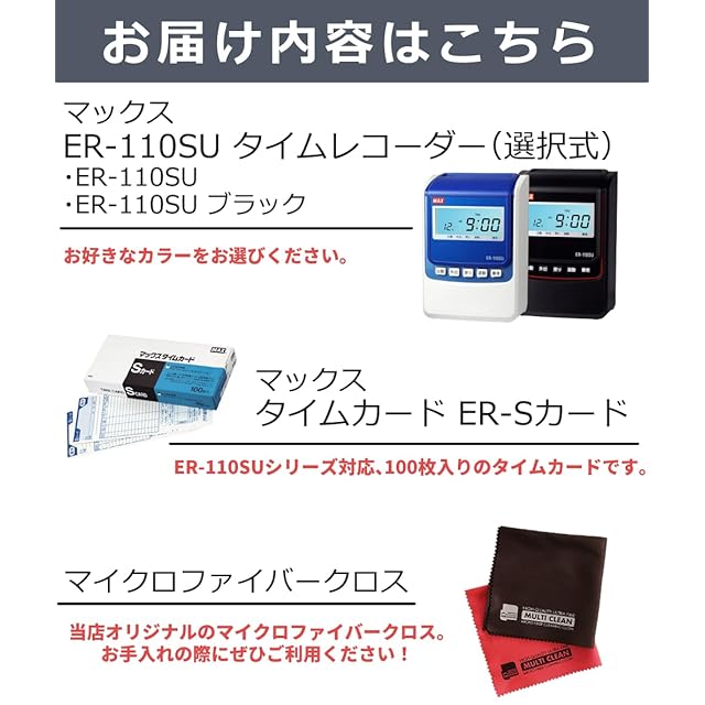 【マックス タイムレコーダー 説明6】(セット内容 計3点セット)マックス ER-110SU タイムレコーダー 1点、ER-Sカード 100枚 1点、マイクロファイバークロス 1点