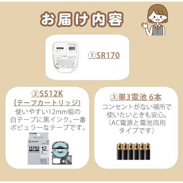 [ラベルライター テプラPRO SR170]、[テープカートリッジ 白ラベル SS12K]、[単3電池 6本]のセット