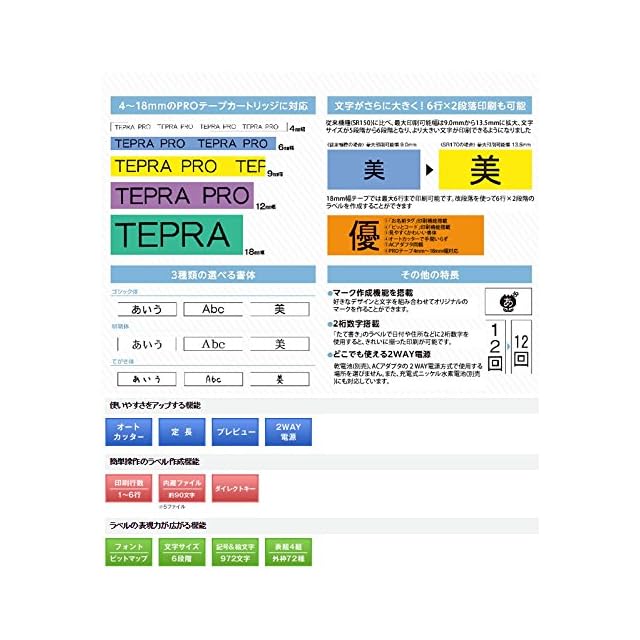 簡単操作で誰でもつかいやすいテプラ ◆豊富な外枠・記号・表組み…あらゆるシーンで使えるかわいい絵文字や外枠が満載 ◆オートカッターで手間いらず…印刷するたびにラベルを自動的にカット ◆よく使う機能はワンタッチで切り替え…少ない操作で編集設定の変更や専用フォームでの印刷が可能です
