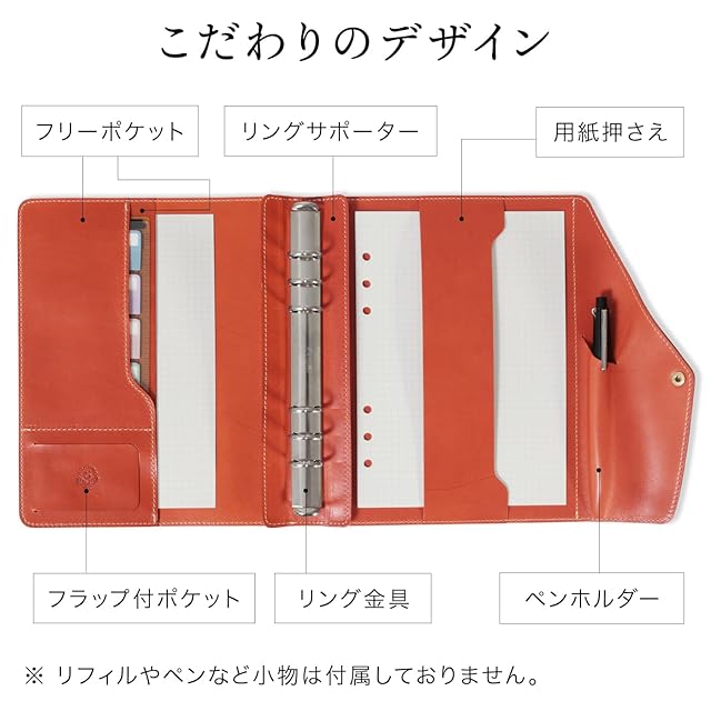 【こだわりの設計と個性的な魅力】 インデックスがはみ出しにくく曲がりにくい設計により、立てて収納が可能など実用性を追求しています。さらに、リング跡を軽減するリングサポーターを採用し、美しい背表紙を維持する独自設計を施しています。携帯性と実用性を両立し、高級感と使いやすさを追求したおしゃれでシンプルなデザインとなっています。長く愛用できる耐久性の高い設計の手帳カバーで、あなただけの特別なスケジュール帳に育てることができます。