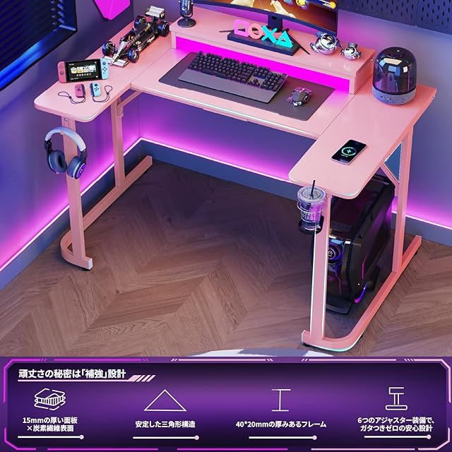 【充実なサポート機能】15mmの厚さの板材を使用し、特殊な炭素繊維テクスチャ表面で耐水・耐熱・耐食・耐磨耗性を実現します。さらに、折り畳み式のカップホルダー、フック、モニタースタンドを備え、デスクスペースを最大限に活用します。ゲーム、学習、仕事など、どんな場面でも快適かつ効率的な環境を実現します。