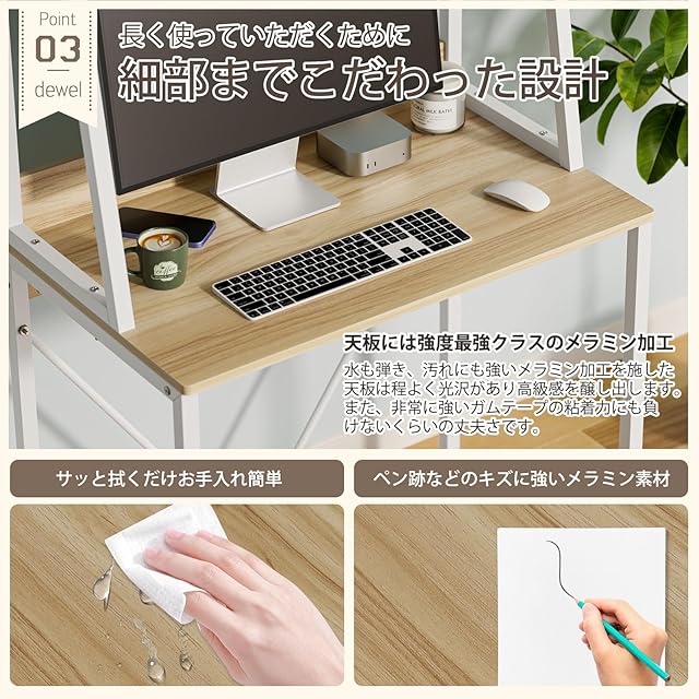 【ワンルームにも最適なサイズ感】幅80×奥行50×高さ155cm(アジャスター含む)【総耐荷重:60kg】天板:40kg 上棚:10kg 中棚:10kg 【材質】パーチクルボード 板厚約1.5cm 天板には強度最強クラスのメラミン加エ水も弾き、汚れにも強いメラミン加工を施した天板は程よく光沢があり高級感を醸し出します。また、非常に強いガムテープの粘着力にも負けないくらいの丈夫さです。【保障について】環境保護レベルE0、このパソコンデスクはSGS認証を取得し、安心してご使用いただけます。