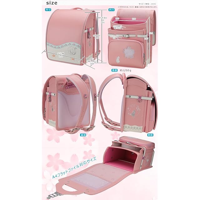 【適用年龄1年生-6年生】縦幅も横幅も広くて、教科書やノート、A4フラットファイルなどがすっぽり入ります!本体サイズ:高33×巾25×マチ17cm (主収納室) 重量:約1200g 素材:本体=人工皮革(R)F ニューモ(R)ST 背当・肩ベルト裏=人工皮革(R) 内装=合成皮革 カブセ裏=合成皮革 ワンタッチロック