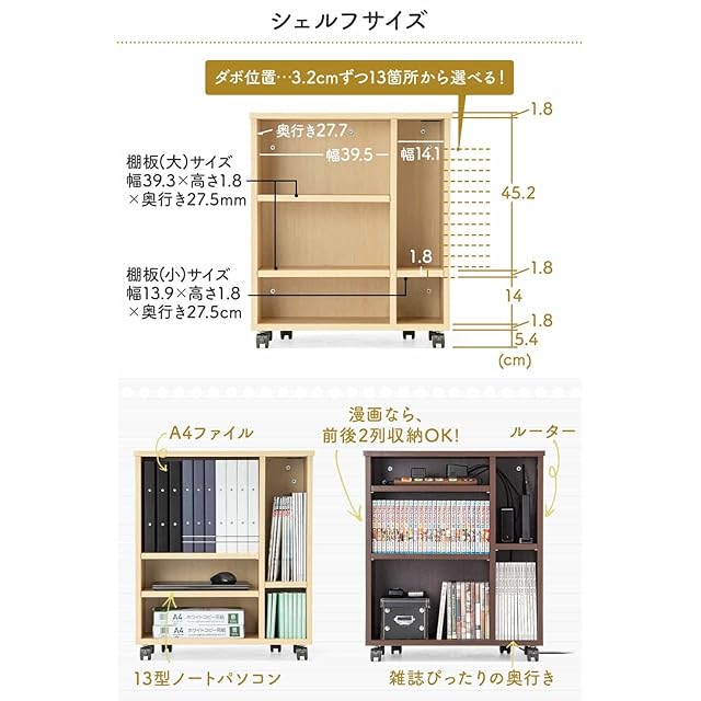 ワゴンの中棚は3.2cmずつ調整ができるので、任意の場所で調整することができます。