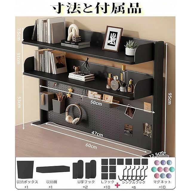 【幅広いアクセサリー】アクセサリーセットには、収納ボックス、U字型フック、L字型フック、マグネットが含まれており、さまざまな小物を効果的に整理できます。レイアウトを自由に配置でき、アイテム次第で使い方が広がります。。