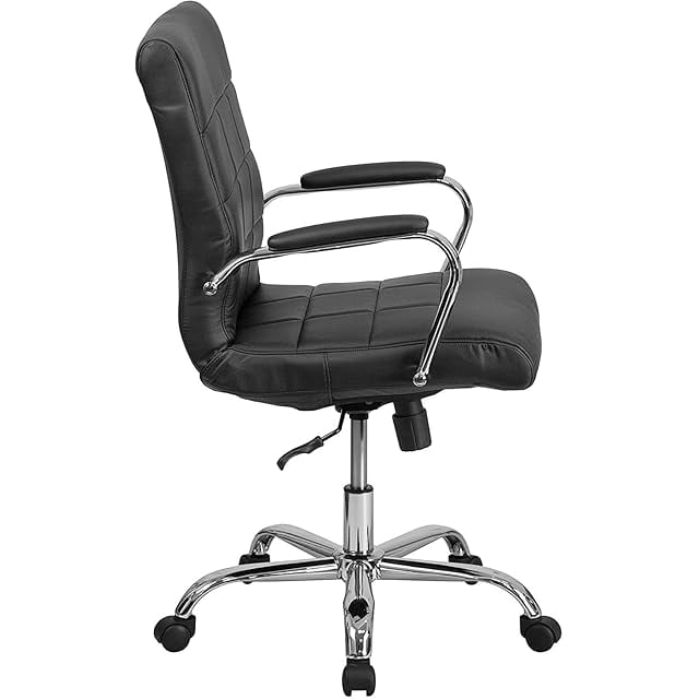 ブラックビニールキルトの背もたれと座面が特徴のミッドバックオフィスチェア、ANSI/BIFMA規格X5.1-17準拠
