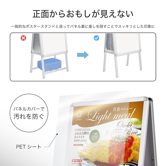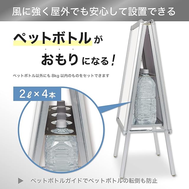 強風に強い転倒防止機能付きポスタースタンド。2Lのペットボトルを4本おけるから重し対策が不要です。※ペットボトルは付属していません