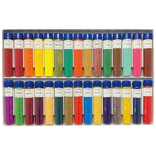 古くは泥絵具(土絵具)と呼ばれ、山から採掘した泥や土を使用しました。水干絵具はこれらを「水」で精製し、不純物を取り去ったあと、板状に「干」し上げることから、こう呼ばれます。色彩の多様化にともない、人造顔料を加えることで、多数の色数を揃えることができるようになりました。新しい製法を取り入れ、高品質で豊富な色彩ラインナップを誇る吉祥の水干絵具ですが、基本的な製法は昔から変わることなく続けられているといいます。 ●約20cc棒ビン入30色セットNo.1 ●1辰砂・2燕脂・3赤橙・4山吹・5鮮光黄・6鶯茶緑・7緑青・8朱・9黄土・10梅鼠・11青瓷・12煤竹・13花白緑・14紅梅・15栗皮茶・16赤紫・17黄草・18鎌倉朱・19古代紫・20肌色・21青銅・22金黄土・23鮮光朱・24浅葱・25米樹・26紫・27素鼠・28菜種色・29皮鉄・30洋紅