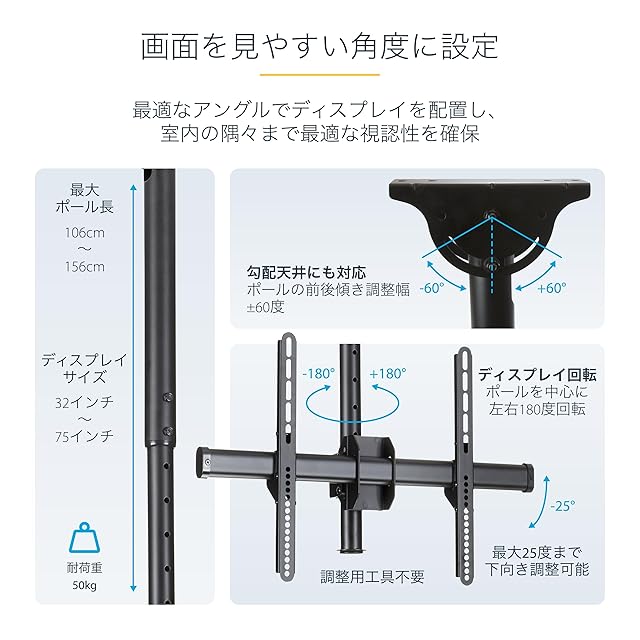 広視野角に対応:ツールを使用せずに、ポールの周りにテレビを左右+/-180度旋回&下方に25度の調整可能。快適な視野角を提供するフルモーション天井吊りテレビマウント
