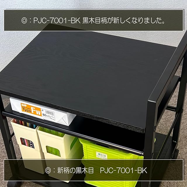 ★新柄 黒木目柄: 板の表面には高級感のある木目柄の凹凸加工が施されています。●デスクの下に収納しやすいサイズ ●キャスター付きで移動も楽々ハンドル付き ●多機能プリンターも載せられます。●取っ手(ハンドル)の向きは左右どちらにも設定が可能です。