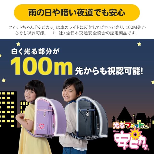 【雨の日や暗い夜道でも安心】フィットちゃん「安ピカッ」は車のライトに反射してピカッと光り、100M先からでも視認可能。一般社団法人 全日本交通安全協会の認定商品にもなっている安全・安心のランドセルです。
