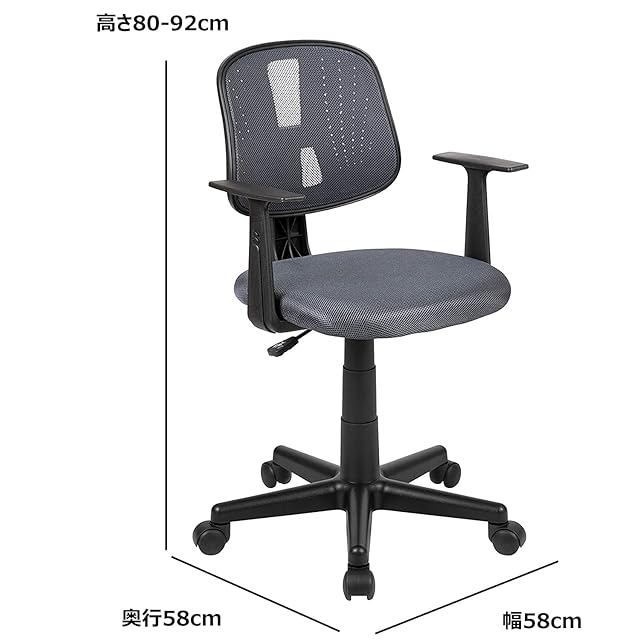 商品サイズ : 全体のサイズ: 幅58×奥行58×高さ80~92cm、シートサイズ : 幅43×奥行43×高さ41~52cm、バックサイズ : 幅41×高さ42cm、アームサイズ : 床からの高さ59~71cm、座面からの高さ18cm。