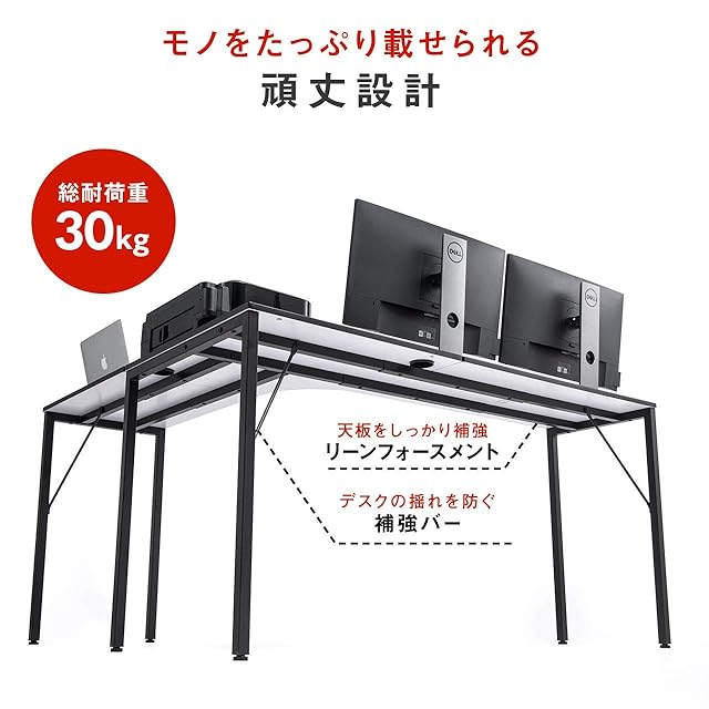 様々な用途で使用でき、デスクを内向きにして作業ブースを作る配置も可能です。総耐荷重は30kgで、ディスプレイやプリンタなども楽々設置が可能です。