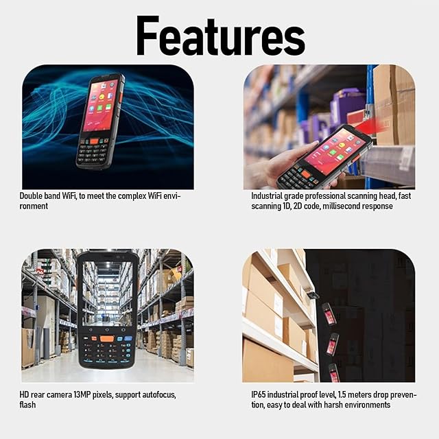 高解像度のイメージングとディスプレイ:5MPフロントと13MPリアHDカメラを装備したこのバーコードスキャナーデータコレクターは、クリアな画像キャッチをします。 4インチ高解像度のLCDマルチタッチスクリーンにより、製品コードを介して簡単かつ正確な情報チェックを可能にし、ワークフローの効率を高めます。