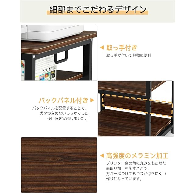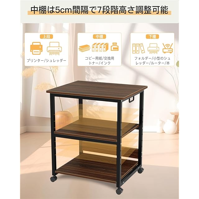 DEWEL プリンターワゴン 3段 キャスター付き 総耐荷重90㎏ 中棚調整 木製 収納 A3対応 プリンターラック サイドワゴン 組み立て簡単 (ウォルナット)