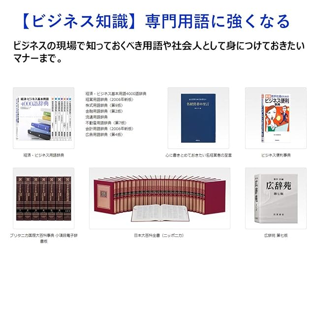 収録辞書:国語系、英語系、英会話・トラベル、学習、生活・実用、実務・情報、その他(合計180コンテンツ)