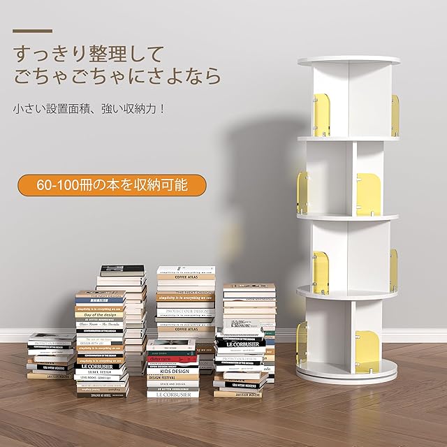 【キャスター付き・360度回転】こちらの回転式本棚は四つのキャスターが付 いており、好きなところに勝手に移動できるだけでなく、360度回転すること もでき、自分が移動せずに取りたいものが探しやすいです。また、この本棚の キャスターは静音のタイプで、前輪には安心のストッパーがあり、でこぼこな 地面に置いても安定し、転倒などの心配がありません。そして、掃除や引っ越 しの場合に移動しやすく、とても便利です