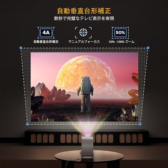 【自動垂直台形補正+手動フォーカス調整】 EGOBASのスマートプロジェクター(内蔵アプリ対応)は、27~200インチまでの投影サイズに対応しています。WiFi&Bluetooth対応のこのプロジェクターは、自動垂直台形補正機能を搭載しており、上下方向の傾きを自動で素早く補正し、数秒で映像を正しく整えます。また、手動フォーカス調整も可能で、工具不要・片手で簡単に操作でき、くっきりとしたクリアな映像を楽しめます。 さらに、ネイティブ720P HD解像度に対応し、4K/1080P入力もサポート。400ANSIルーメンの明るさと10,000:1の高コントラスト比により、細部まで鮮明な映像を映し出します。