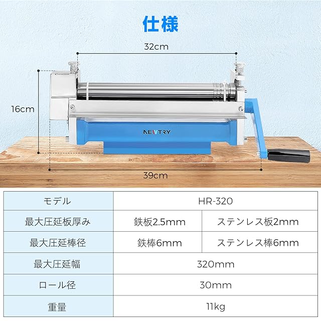 <b>★ご了承:</b><br> 本店には一年安心保障があります。何かご不明やお気づきの点がございましたら、お気軽にご連絡ください。<br> <br> <b>仕様:</b> <br> 1.モデル:HR-320<br> 2.梱包サイズ:460 * 130 * 270mm <br> 3.正味重量:12kg ;総合重量:13㎏<br> 4.最大ローリング厚さ:2.5mm(鉄板);2㎜(ステンレス鋼板)<br> 5.最大ローリング幅:320mm<br> 6.最大ローリング直径: 6mm<br>回転軸の直径:30mm <br> <br> <b>★大切なこと:</b><br> 購入する前に、仕様をぜひご確認ください。<br> また、お支払いの際、配送する住所または電話番号もぜひご確認ください。<br><br> <b>★本店について:</b><br> Newtryは主にDIY・工具・ガーデン/ホーム&キッチン/文房具・オフィス用品/産業・研究開発用品などを販売するお店です。<br>お客様に最高の商品とサービスを提供することを目指しています!