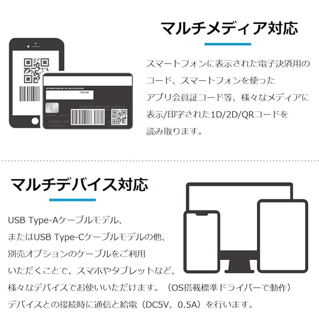 ドライバー不要で日本語を含む2バイト文字の読み取り可能 ※ Windowsのみ、他条件による (Shift_JIS・UTF-8の文字コードは、設定による選択が必要です。文字コードの自動認識は行いません)