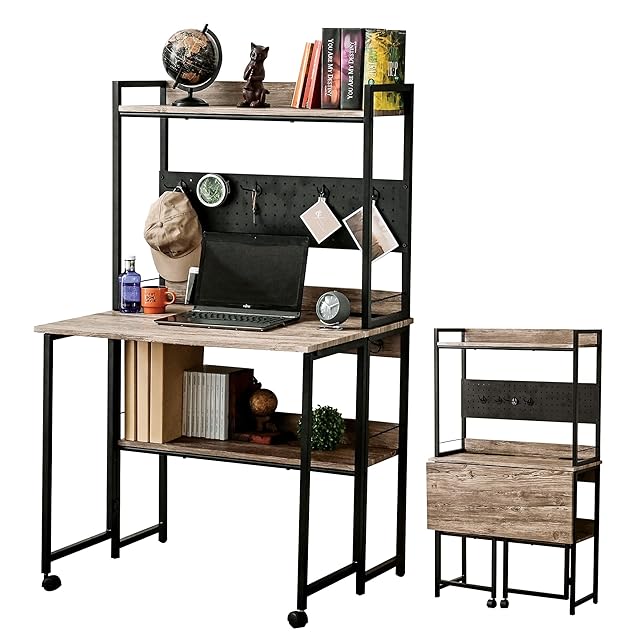 折りたたみデスク 収納棚付き パソコンデスク 幅80cm コンパクト PC デスク 机 キャスター付 コンセント付 木目調 トム( ダーク ブラウン )