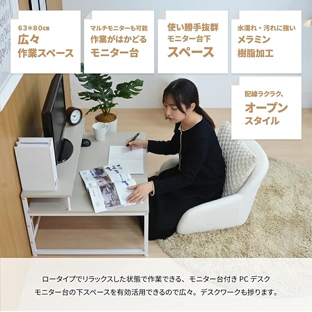 モニター台付きで視線が上がり、自然と姿勢が整うロータイプPCデスク。床座りに最適な設計で、集中しやすく長時間作業にも快適です。