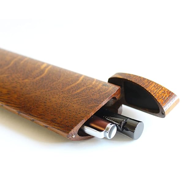 「短刀」をモチーフにした木製ペンケース。流線型のデザインが特徴。内側はペンが傷つかない様に革張りを施しています。フタは回転軸の付いたマグネット式で親指一本で簡単に開閉できます。ペンは2~3本収納可能。ビジネスシーンでも活躍。